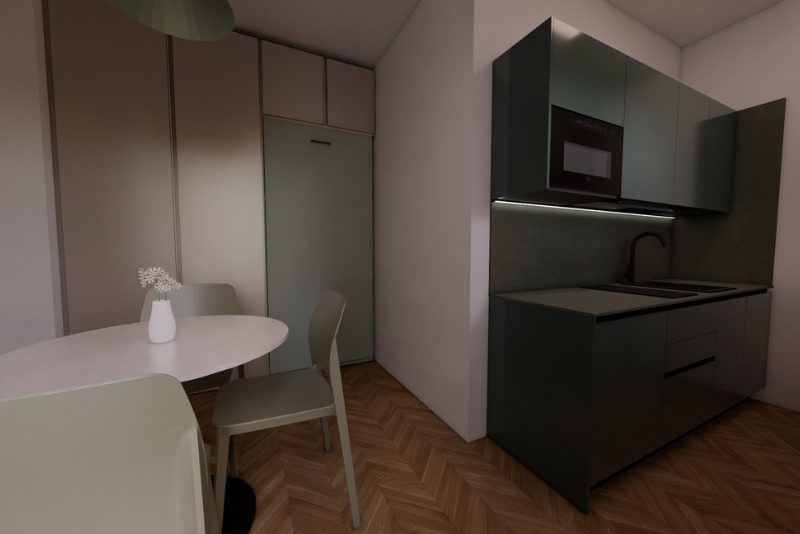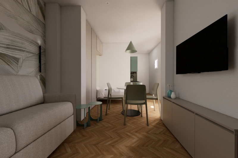 L’appartement dispose d’un lit double king-size, d’un canapé-lit et d’une kitchenette entièrement équipée avec lave-vaisselle et plaque à induction, idéale pour préparer vos repas en toute autonomie. L’espace séjour est parfait pour déjeuner ou se détendre après une journée à la plage.